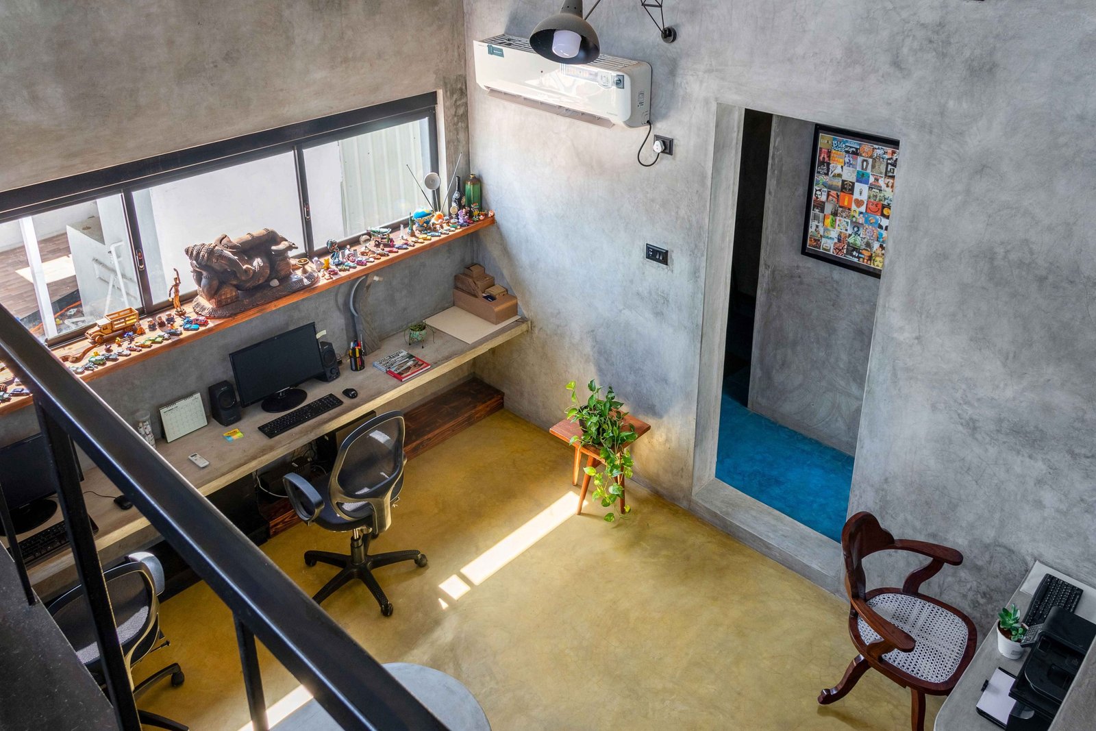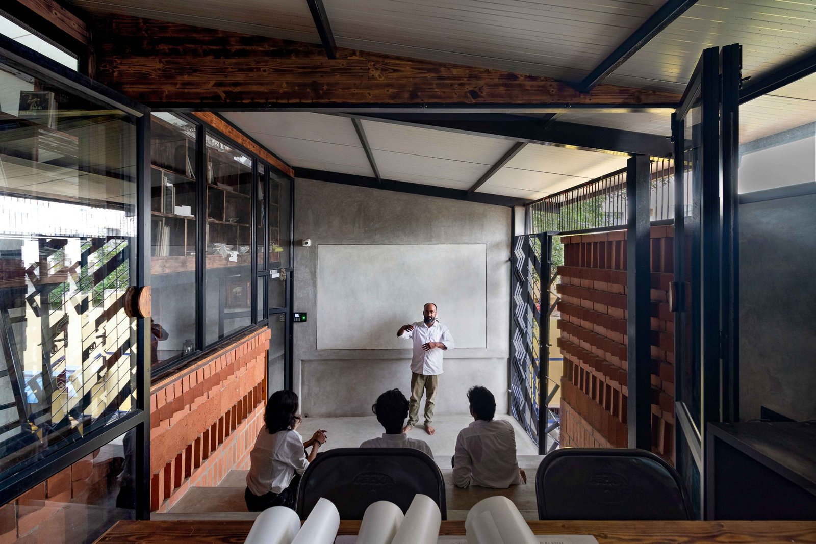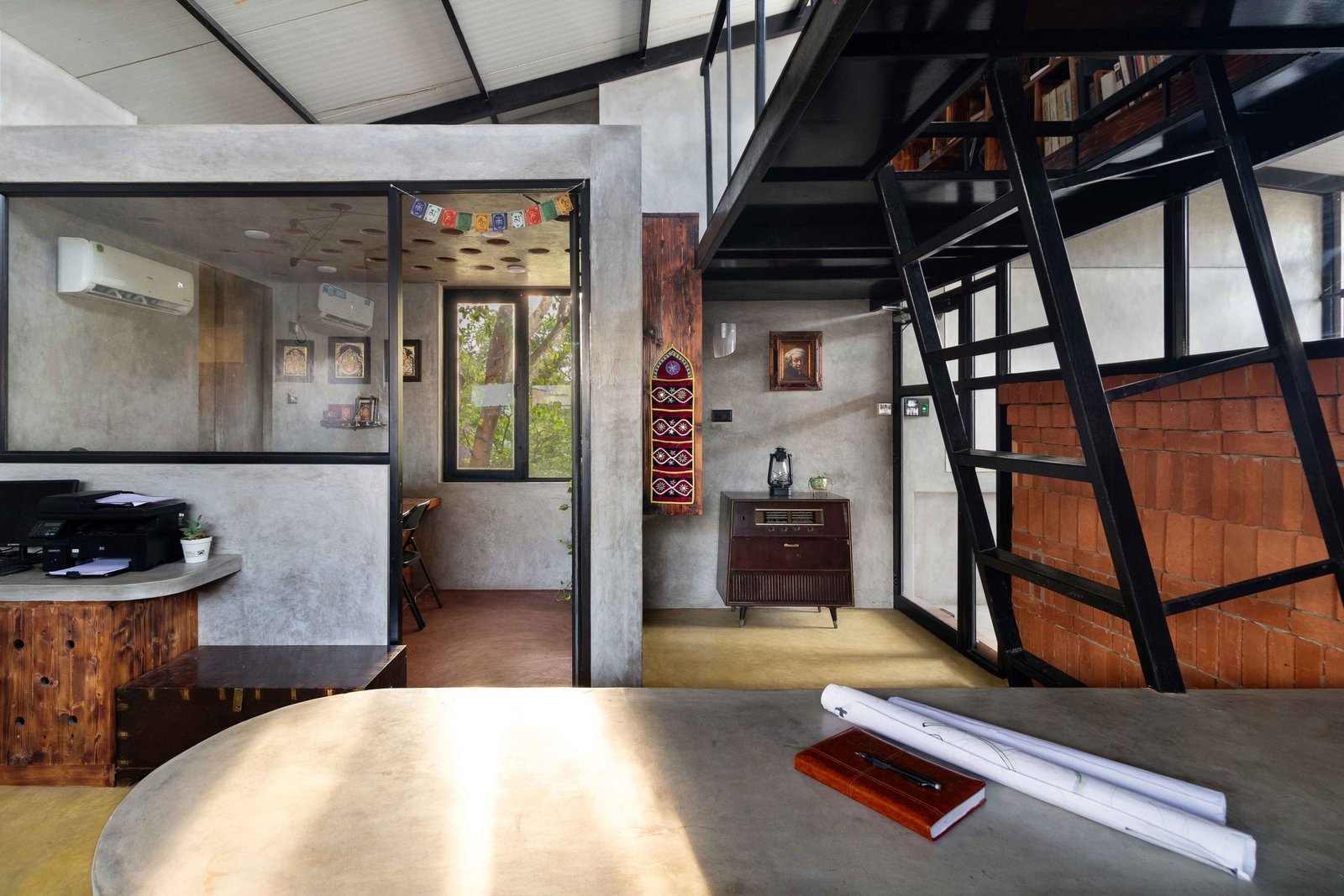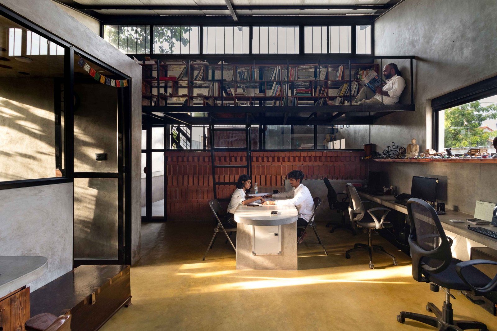A brutalist take on the interior with exposed concrete wall finishes, coloured oxide IPS (indian patented stone) flooring, exposed brick-patterned partitions, steel roof sections, and glasses framed with aluminium were intended to make this studio display architectures commonly used materials and sample for vernacular techniques.