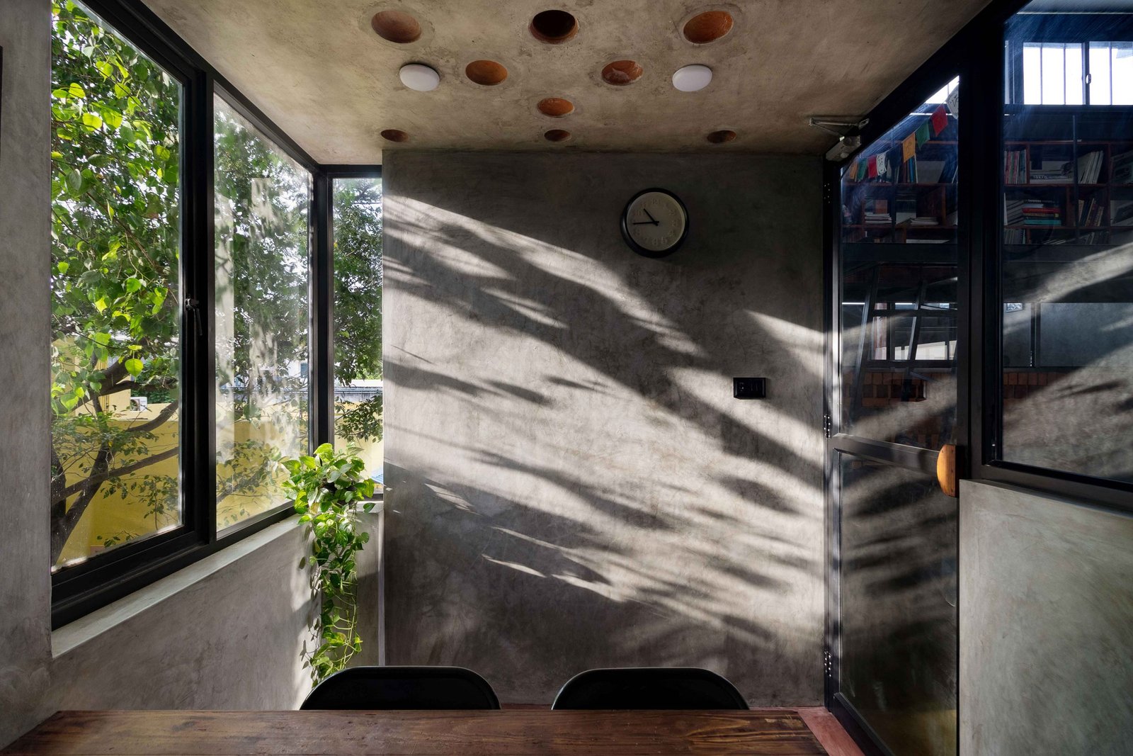 To effectively use the height of the space, a steel mezzanine floor with an open shelf made of charred wooden planks make up for additional library and file storage. Accessed by a ladder, it connects onto the principal cabin’s filler slab roof, providing additional storage. North light coming through the mezzanine floor renders the workspace ambient.