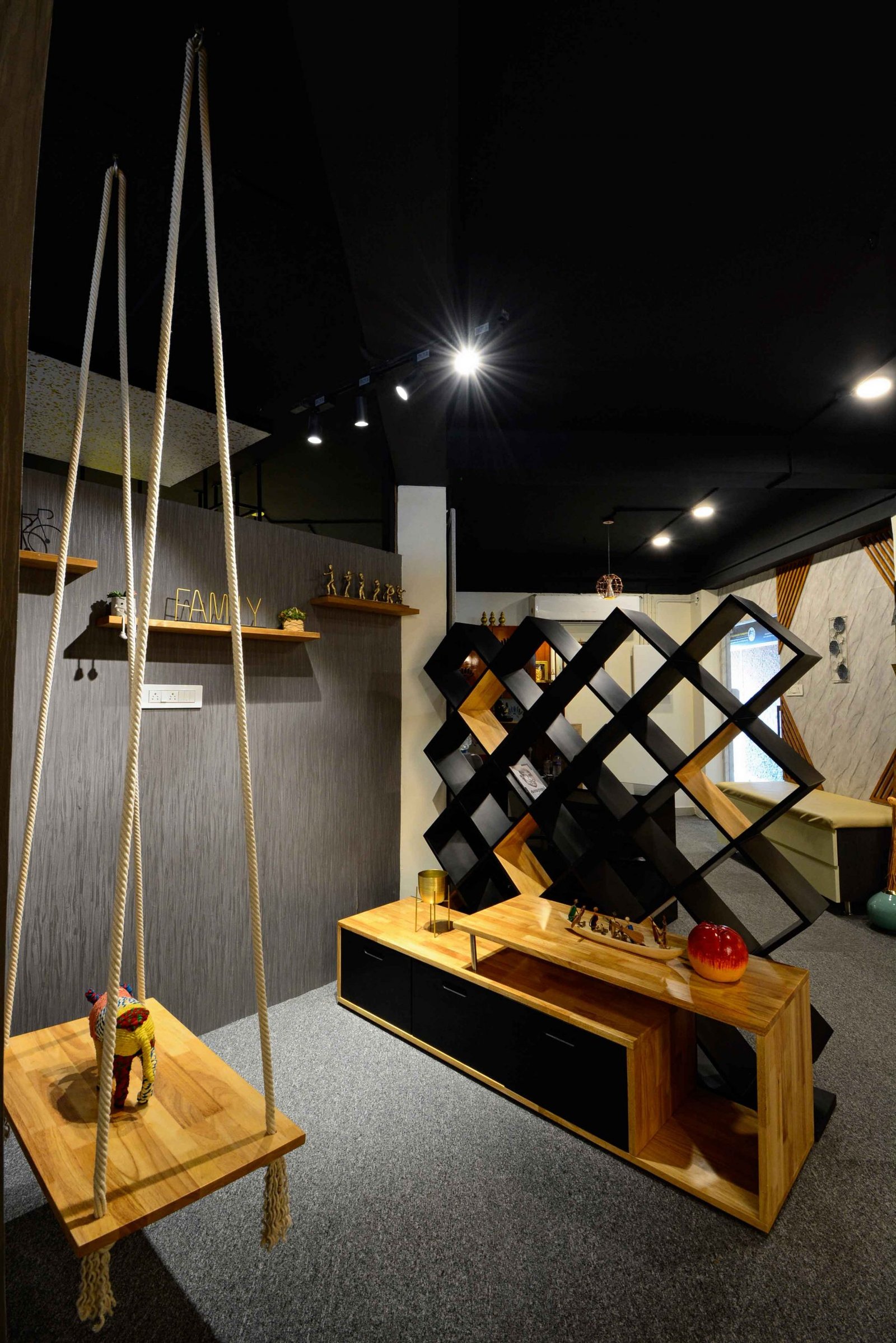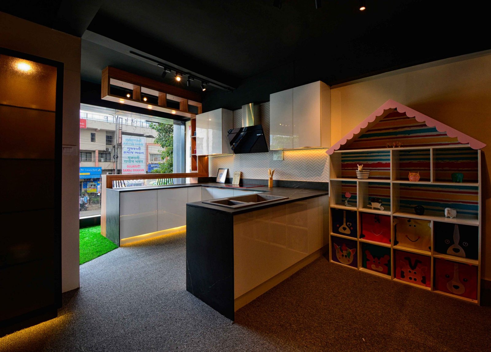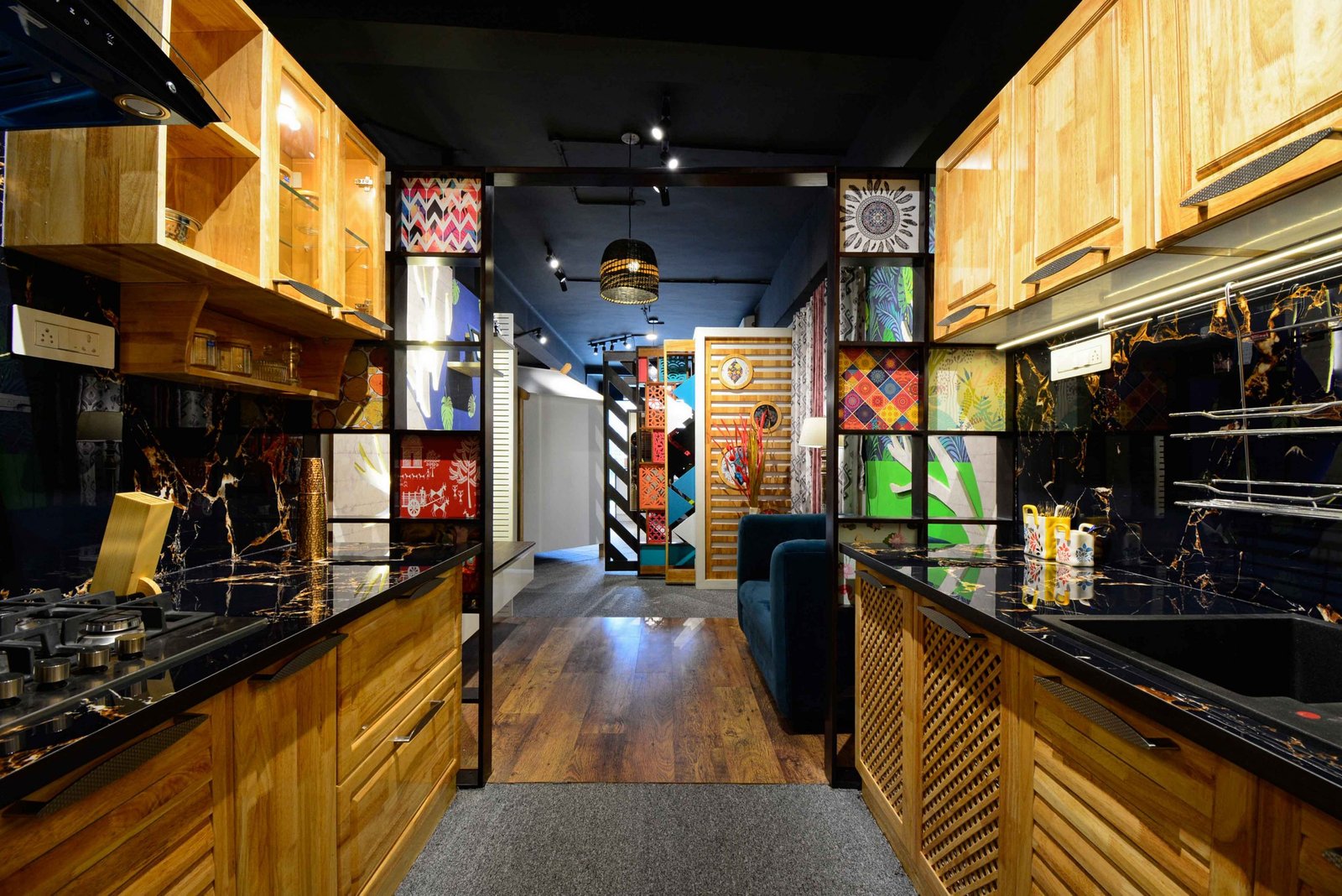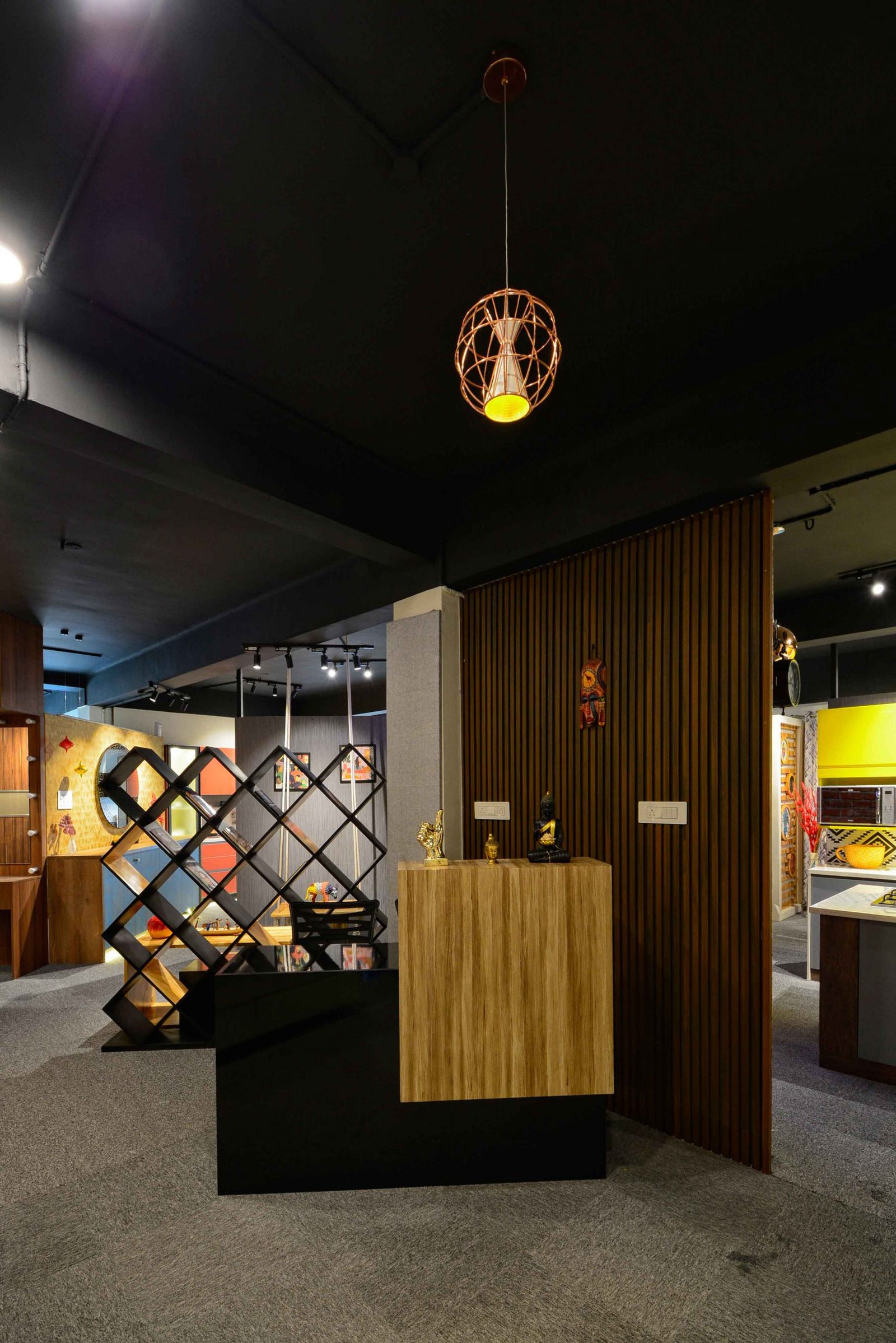 We were delighted when Cookscape approached us to design their new outlet in Coimbatore. Cookscape is a leading Kitchen and wardrobe interior studio based out in Chennai, they have an entire team for design to execution, and this made us feel special that we had been chosen to design their showroom. The brief was simple, to create maximum kitchen units and wardrobe units. We started off by removing all the walls and leaving the frame. The design ideology was to create multiple and haphazard corridors to create a sense of confusion for the user, the idea is to make the user seek new things at every corner or junction; get surprised with what is being used. Lighting colour palates were carefully chosen and detailed out to create a stark yet subtle contrast for a visual experience. Lighting was planned to set the mood at different time of the day, being in a small floor plate the design evolved to be not dumped with everything but still looks like there is scope for more, meaning that anything is possible through design.