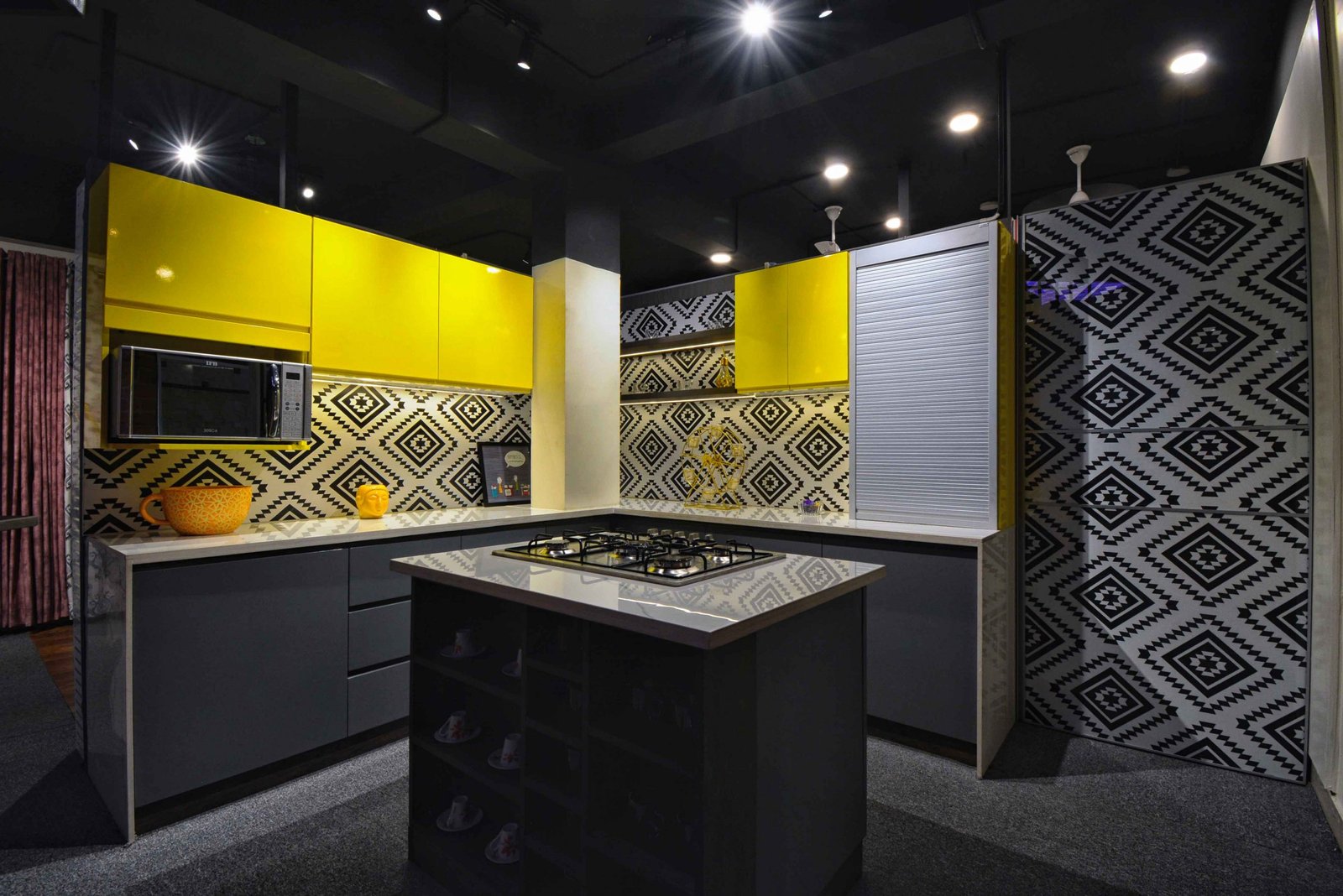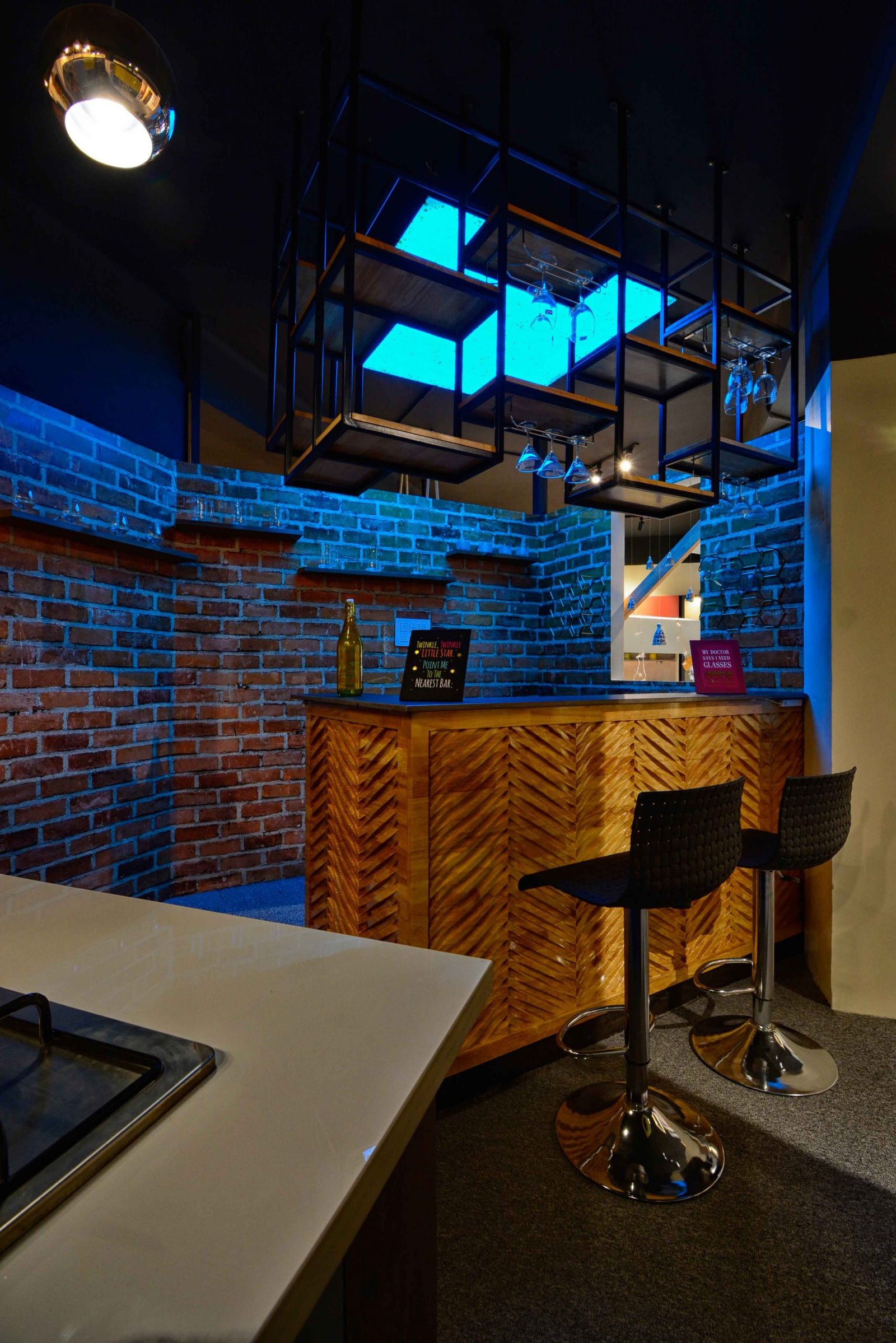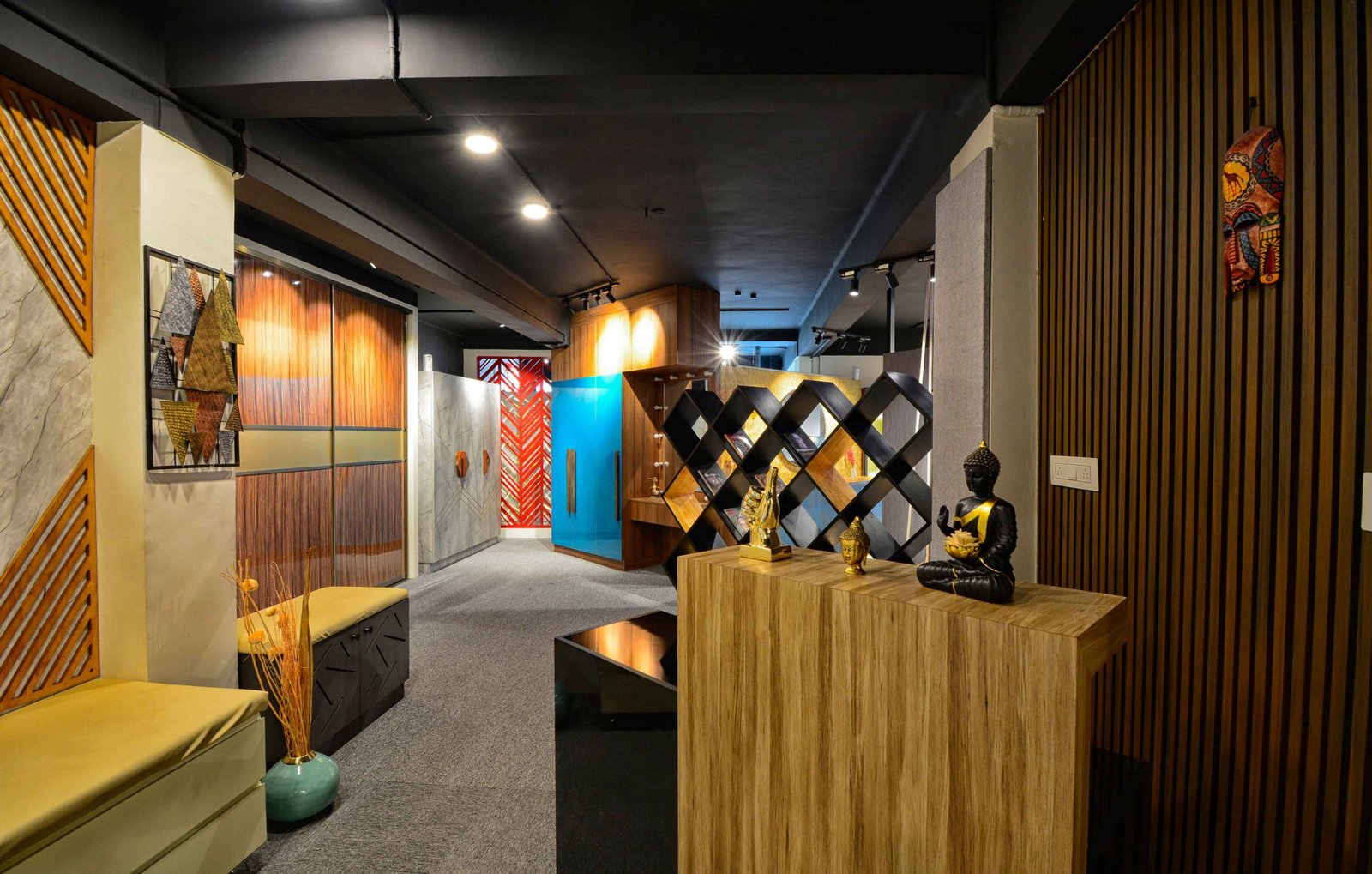 We were delighted when Cookscape approached us to design their new outlet in Coimbatore. Cookscape is a leading Kitchen and wardrobe interior studio based out in Chennai, they have an entire team for design to execution, and this made us feel special that we had been chosen to design their showroom. The brief was simple, to create maximum kitchen units and wardrobe units. We started off by removing all the walls and leaving the frame. The design ideology was to create multiple and haphazard corridors to create a sense of confusion for the user, the idea is to make the user seek new things at every corner or junction; get surprised with what is being used. Lighting colour palates were carefully chosen and detailed out to create a stark yet subtle contrast for a visual experience. Lighting was planned to set the mood at different time of the day, being in a small floor plate the design evolved to be not dumped with everything but still looks like there is scope for more, meaning that anything is possible through design.