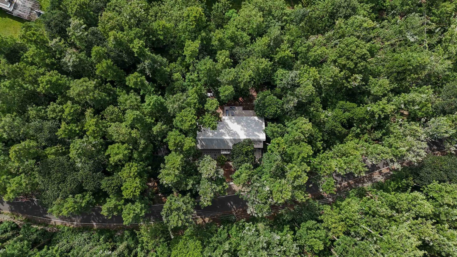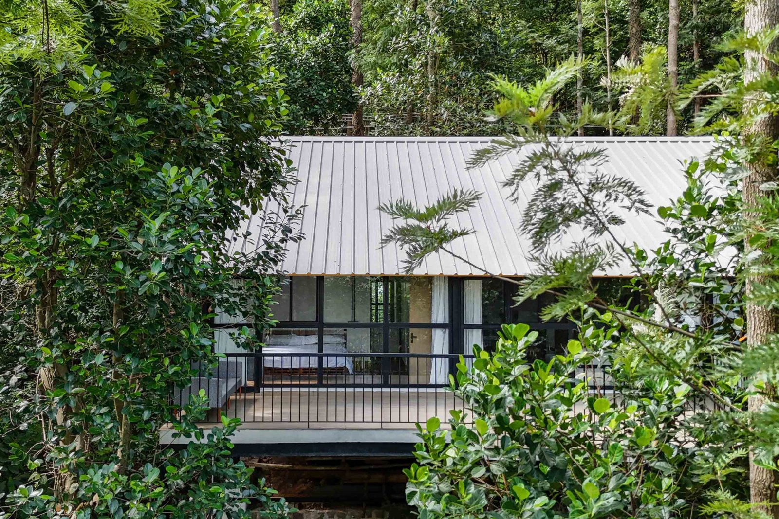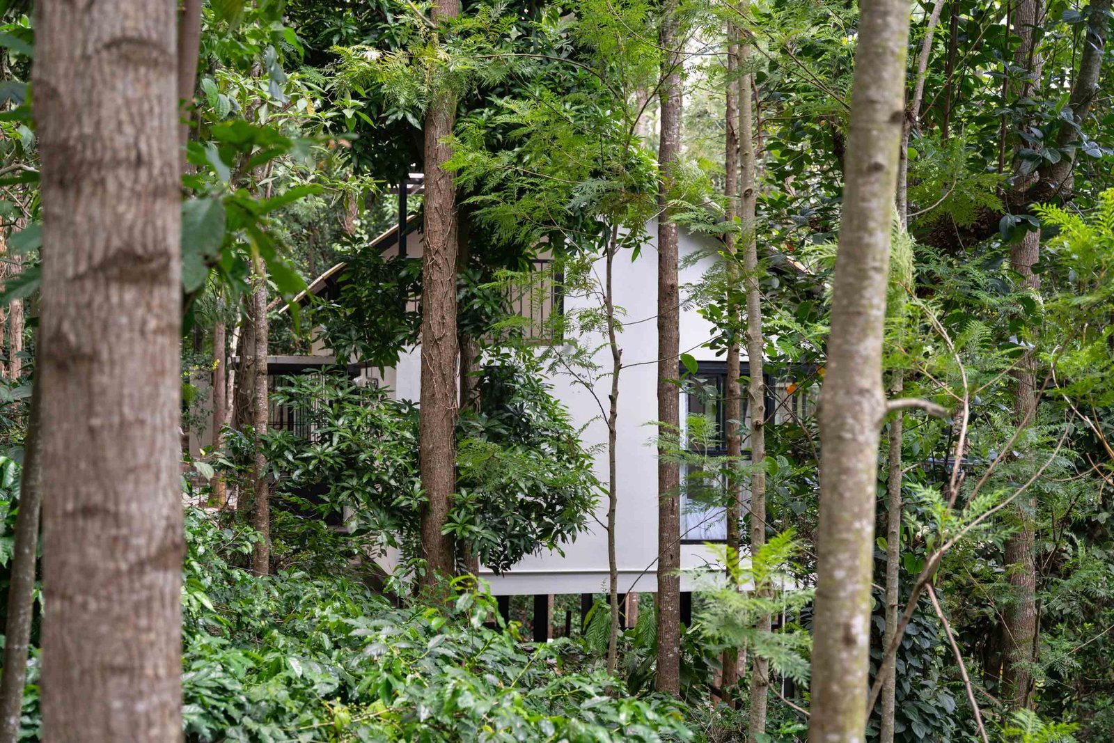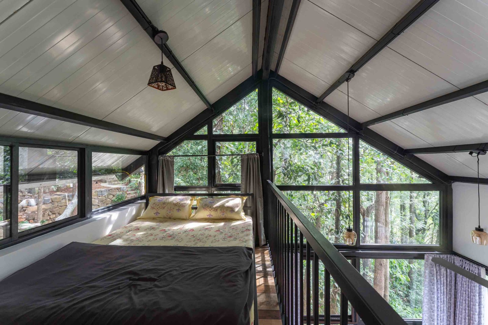 Both bedrooms enjoy panoramic corner views of the woods through the aluminium-glass windows with one experiencing sunrise and the other sunset. The sunrise bedroom has a high ceiling to capture the morning sunlight path while the sunset bedroom has a mezzanine floor with bed space for an extended family.