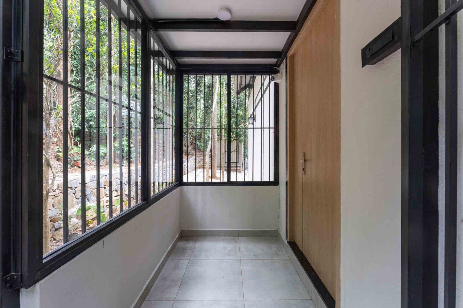 Slowly integrating into the portico, the non-slippery paving helps with the easy maintenance of the falling leaves; the façade, facing the road, is kept minimal to avoid attention and provide privacy, with only a secured foyer projecting out granting access inside the house and a balcony sliced out at the top corner serving dually as breakout space and for surveillance. Upon entry, you experience a cottage that is nestled in between the trees, a humble abode that is peacefully inviting.