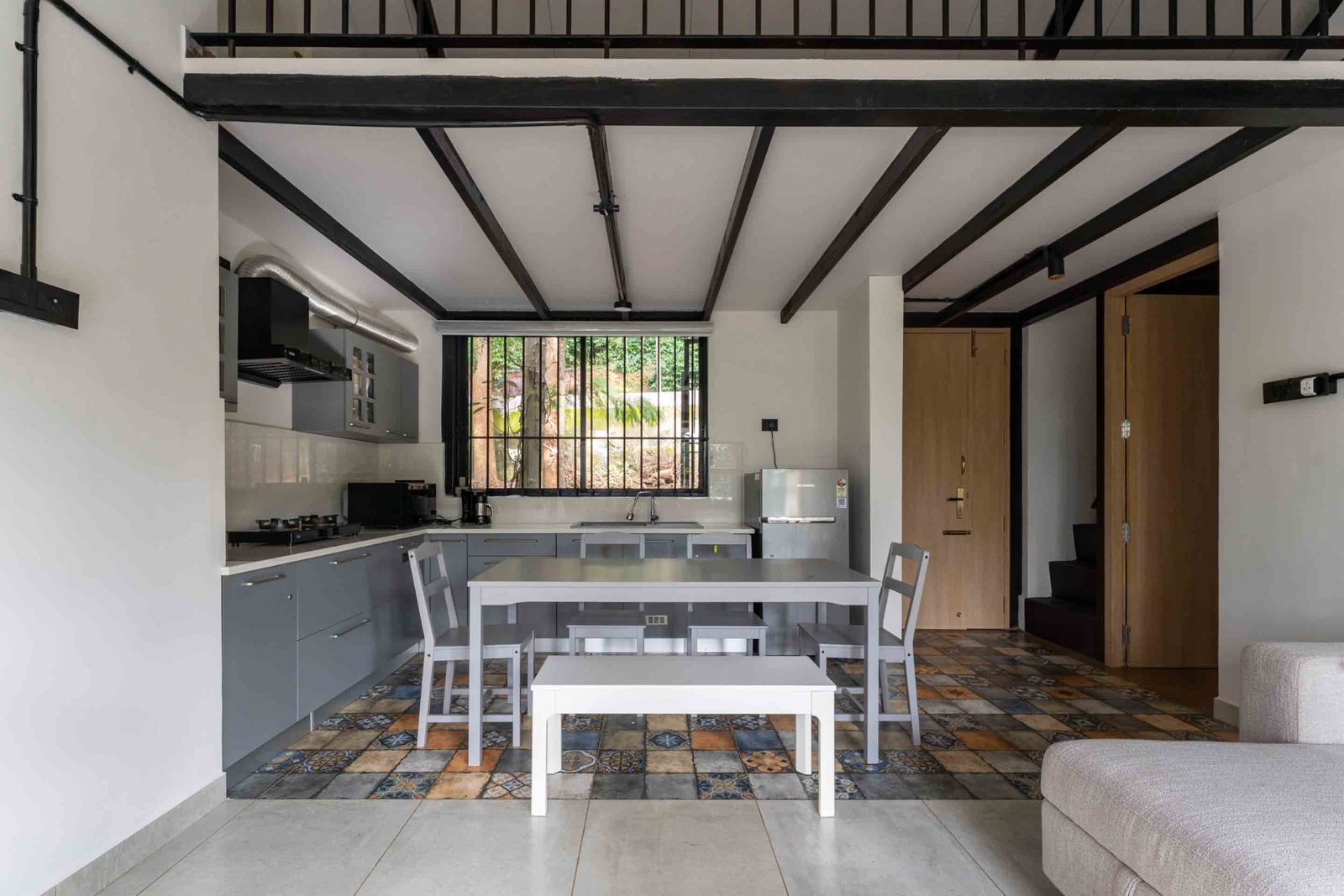 The design of the house sparked with the idea of having bedrooms on either side to capitalize on corner views with the living/social spaces in between. Upon entering from the foyer to a low-height kitchen with a mezzanine, the space expands to the living room with a cinematic view of the deck outside. The use of patterned tile in the kitchen and dining area clearly demarcates the space efficiently. The mood with toned-down greys and browns, exposed conduits that decor up the walls was intentional; to have a clear and minimalistic approach to spatial quality.
