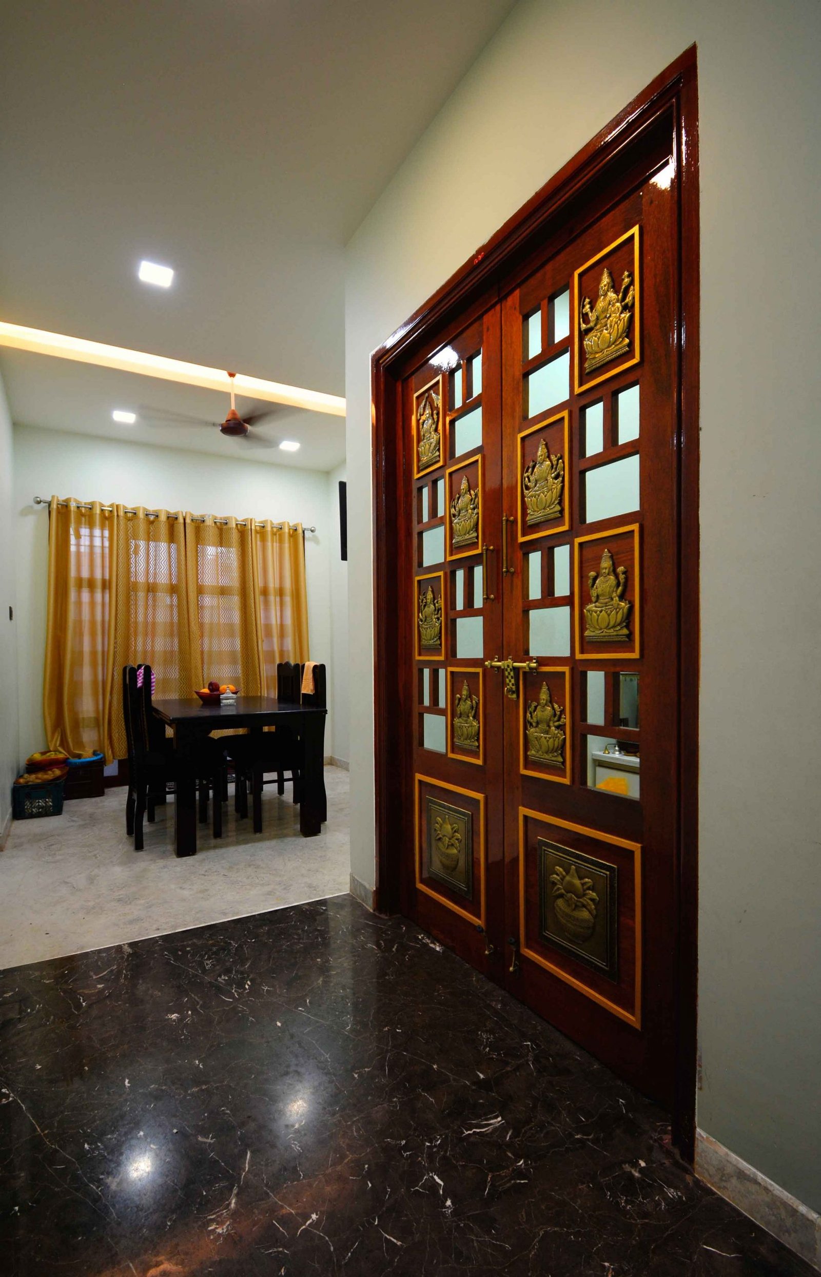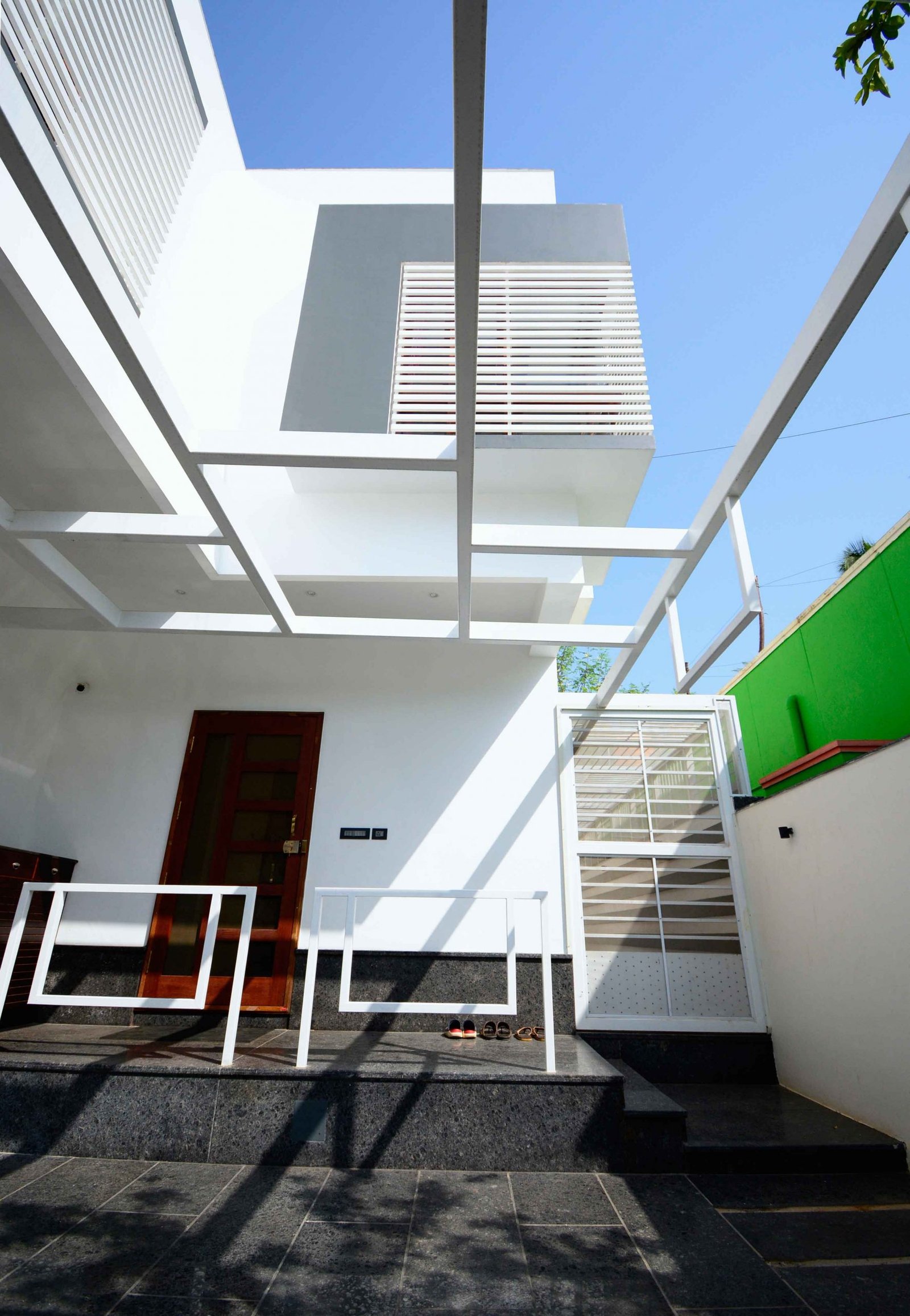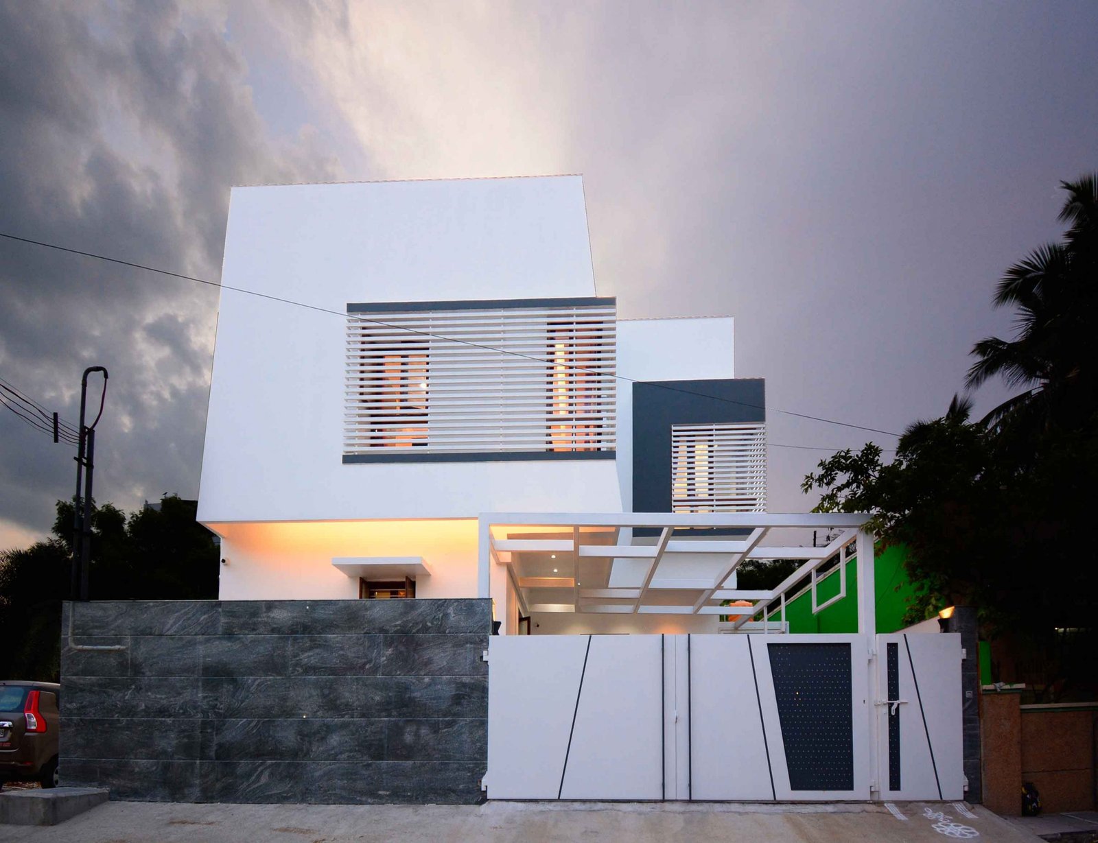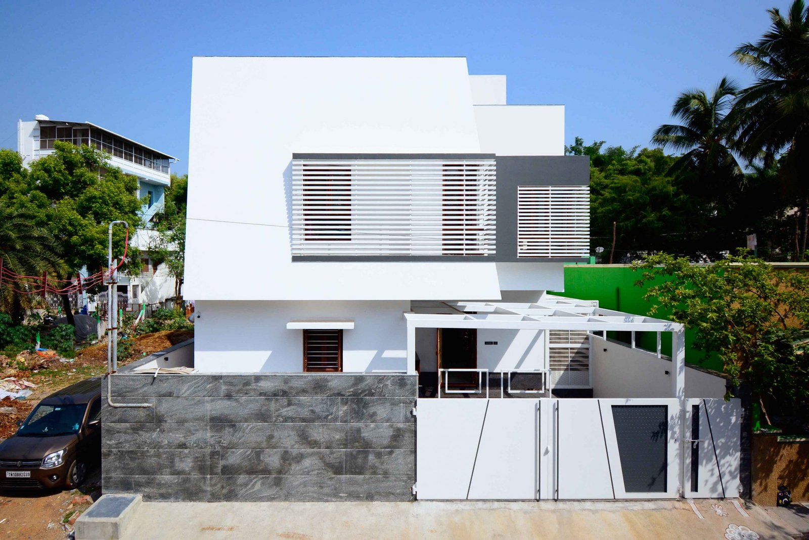 This Modern-Minimalistic home was designed for a joint family in the spiritual city of Thiruvanamalai. The planning of the house was challenging since it had to accommodate the entire family’s requirement and it had to be as per vasthu as well. The house is a six bedroom house with open terraces and balconies at every level , on the ground floor the setback spaces were designed as outdoor seating and service areas. the family enjoyed natural light and ventilation , for which we have provided long French doors and windows. the road facing bedrooms come with corner bay windows to make the rooms appear larger and to maximize light inside and proving view outside. The facade was kept simple and minimal with use of white and grey shades for the exterior. The plan is simple with the living , dining , kitchen and parents bedroom along with lift on the ground floor, the first floor accommodates  three bedrooms two balconies and a family space , the top floor has a single bedroom with balcony and a lounge opening to the open terrace.