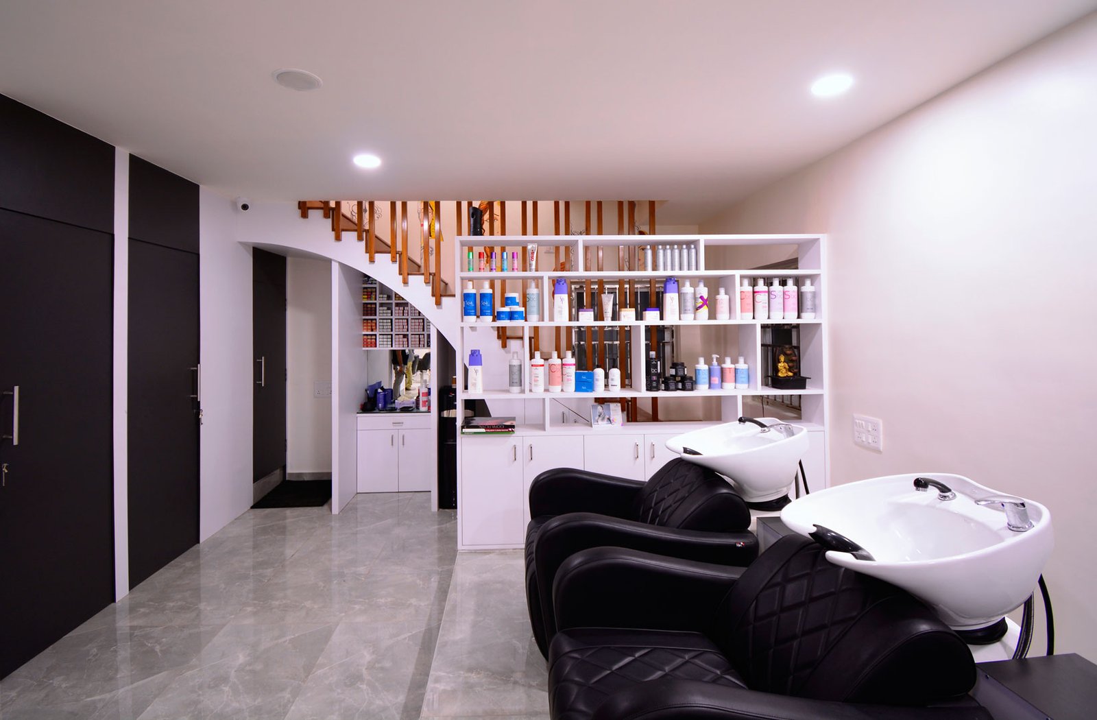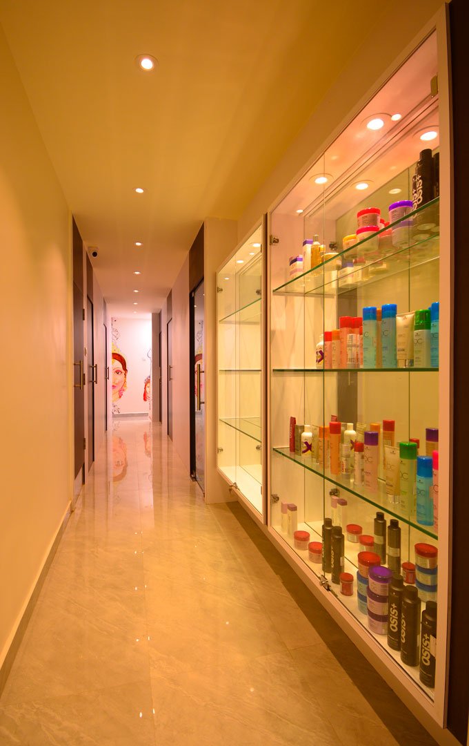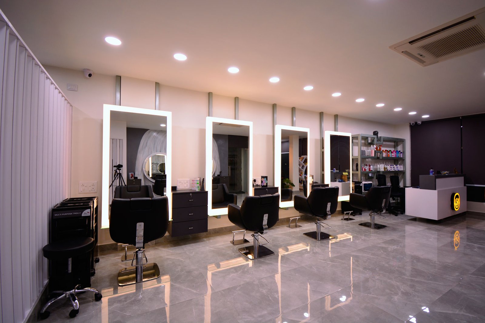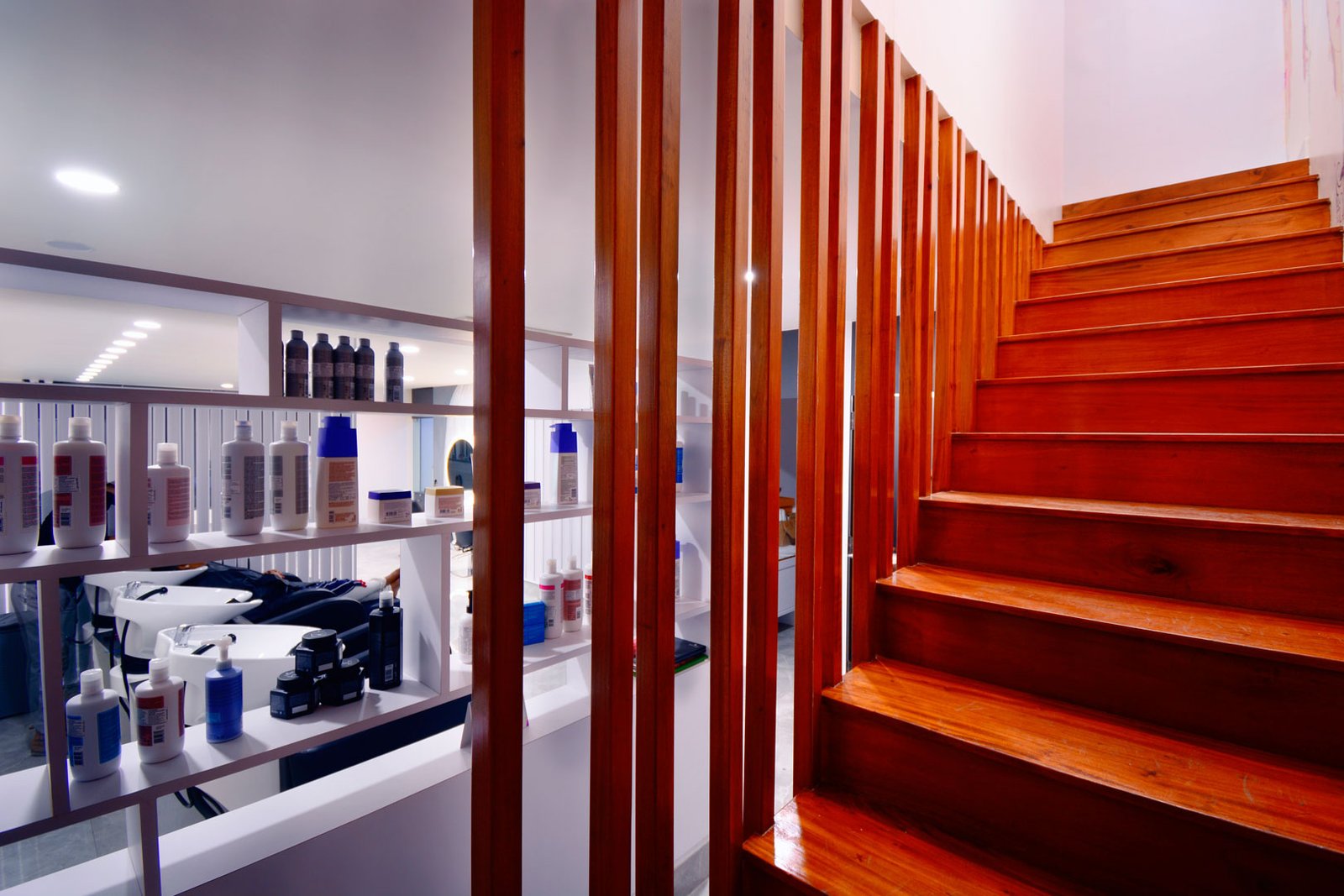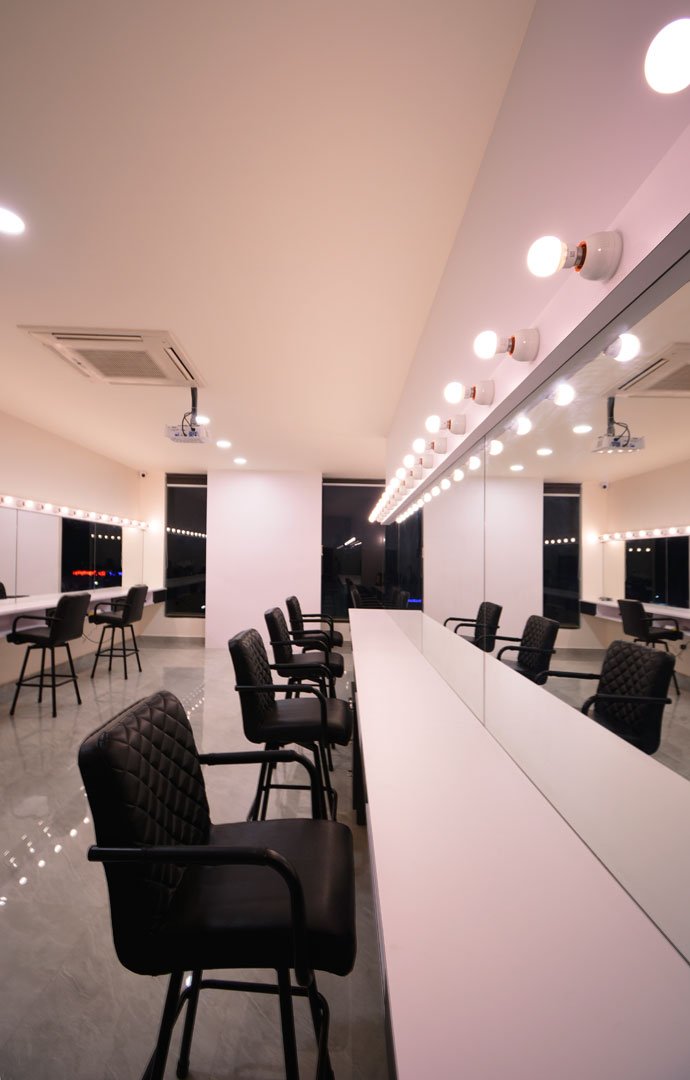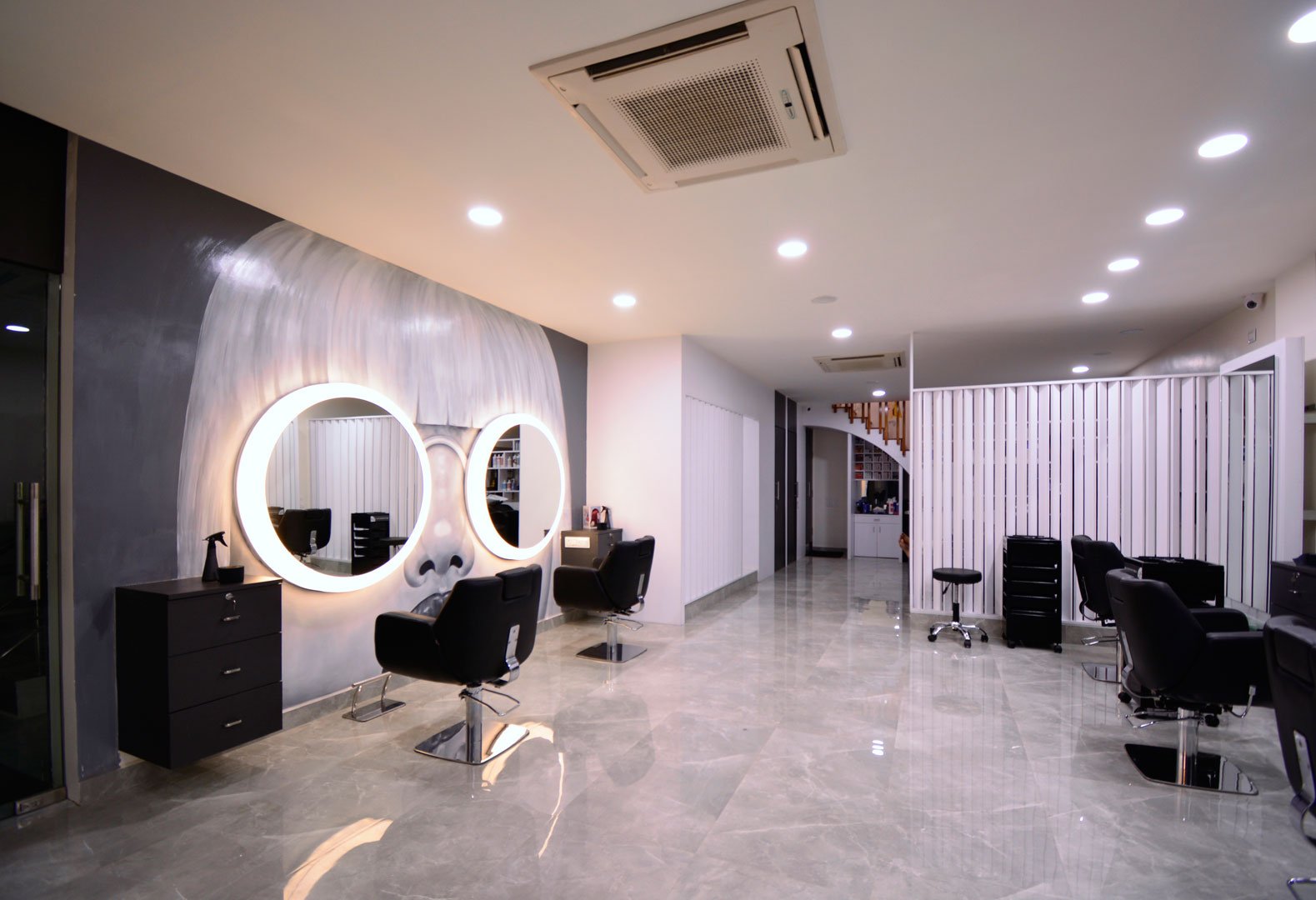 The Design brief for the salon and bridal training academy was to be simple minimalistic with tones of grey. Our proposal was to not have any designed furniture on the floor and to be lifted up for easy maintenance and also connect with the brands name. The mirrors were all lit with warm light and the ceilings with white light, A wooden staircase was introduced to reach the bridal training academy and vertical lines of the staircase act both as a design element as well as a handrail. Grey tones on the furniture make the space look more spacious and dirt free visually. Wall art in monochrome was designed with circular back lit mirrors to add life and creativity into the space