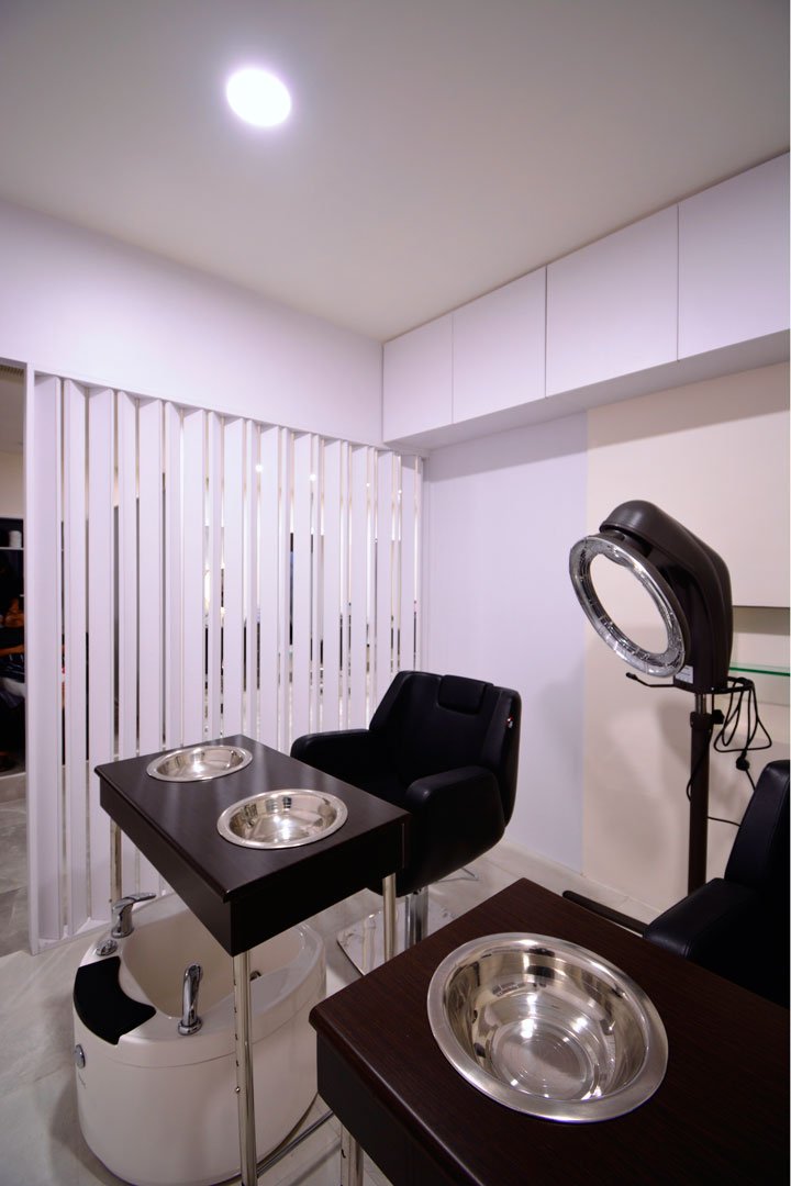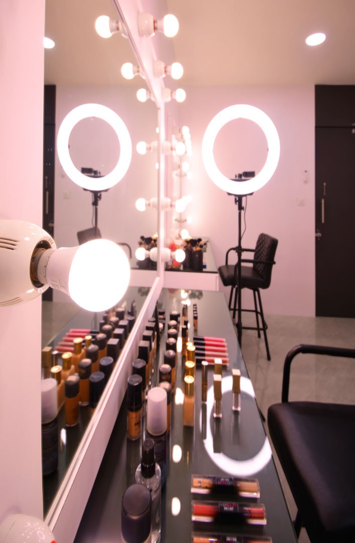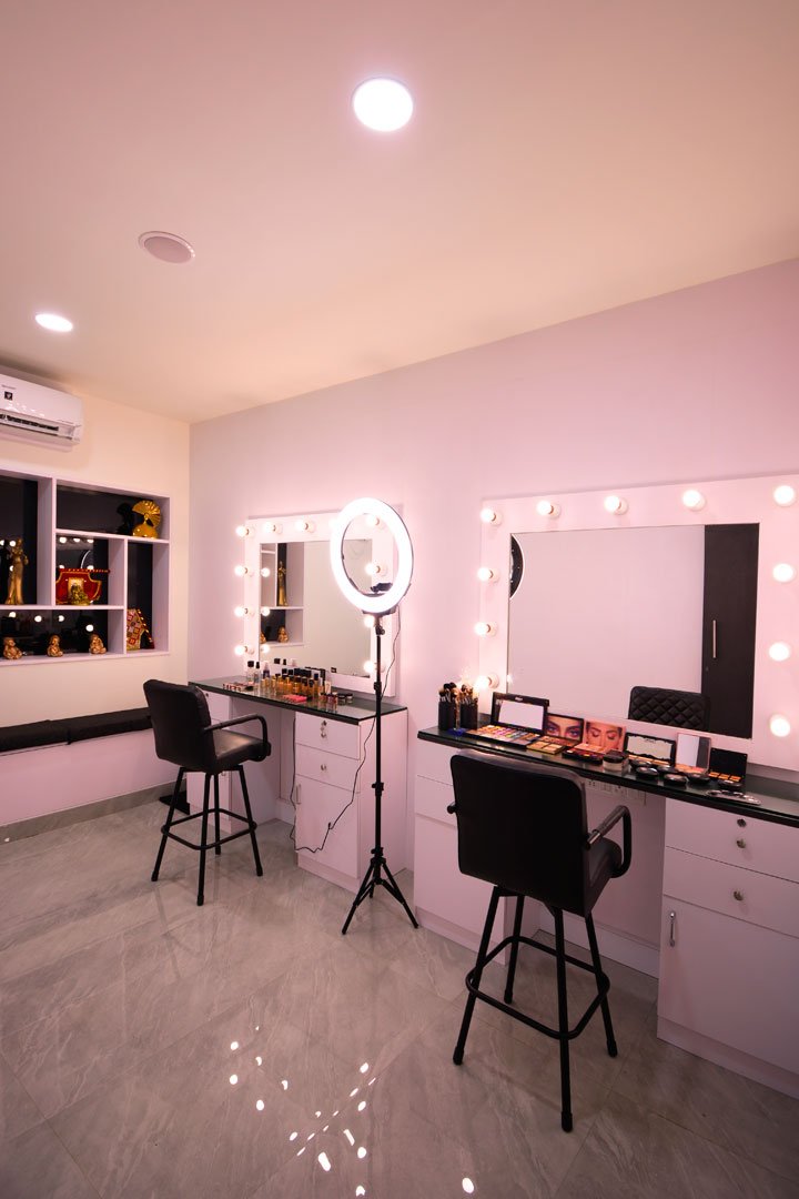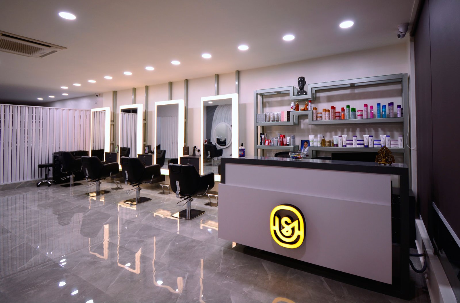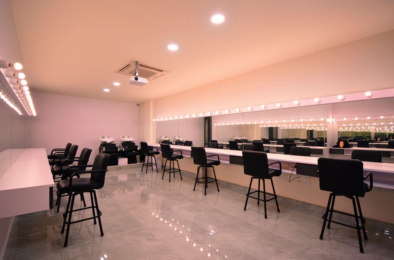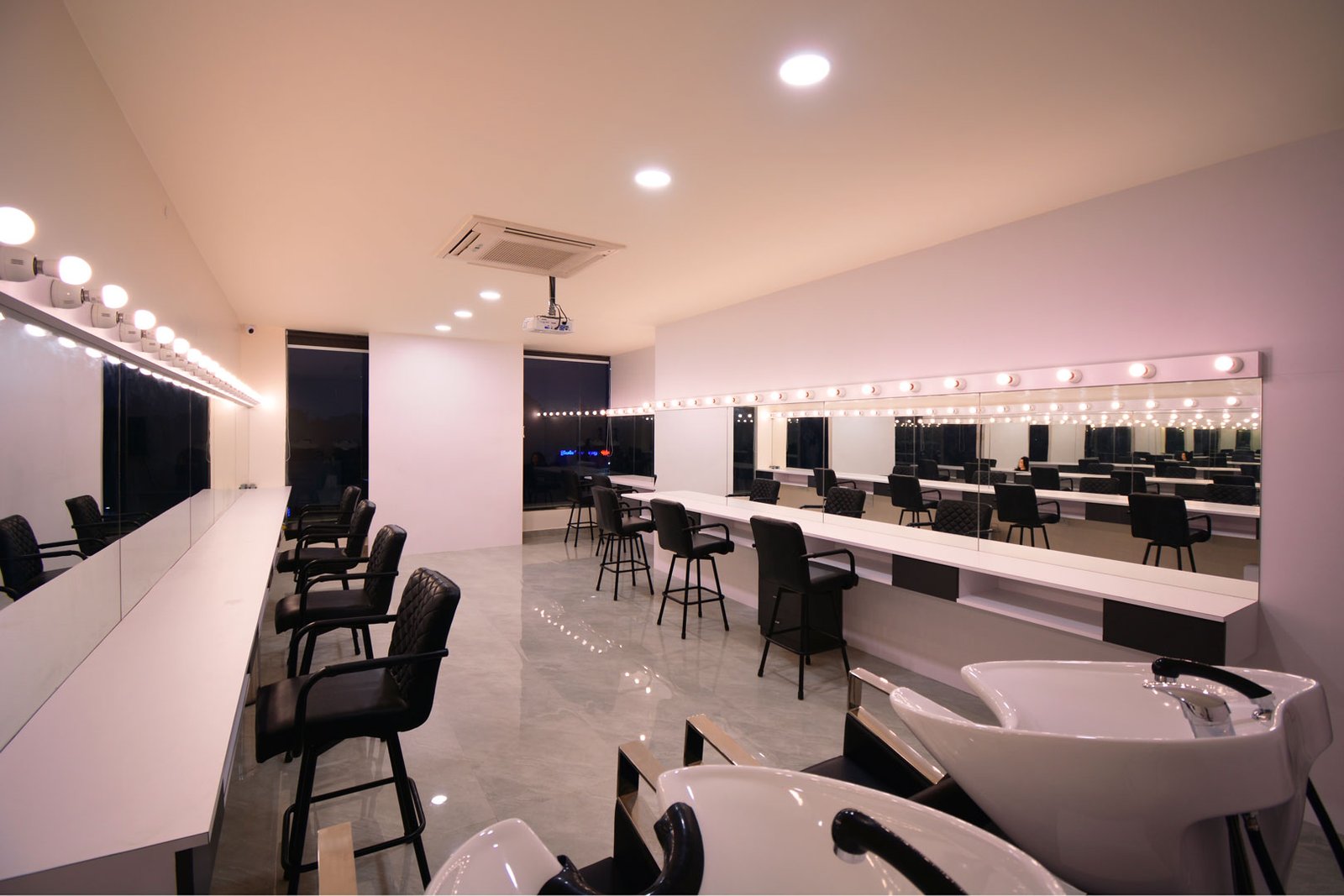 The Design brief for the salon and bridal training academy was to be simple minimalistic with tones of grey. Our proposal was to not have any designed furniture on the floor and to be lifted up for easy maintenance and also connect with the brands name. The mirrors were all lit with warm light and the ceilings with white light, A wooden staircase was introduced to reach the bridal training academy and vertical lines of the staircase act both as a design element as well as a handrail. Grey tones on the furniture make the space look more spacious and dirt free visually. Wall art in monochrome was designed with circular back lit mirrors to add life and creativity into the space