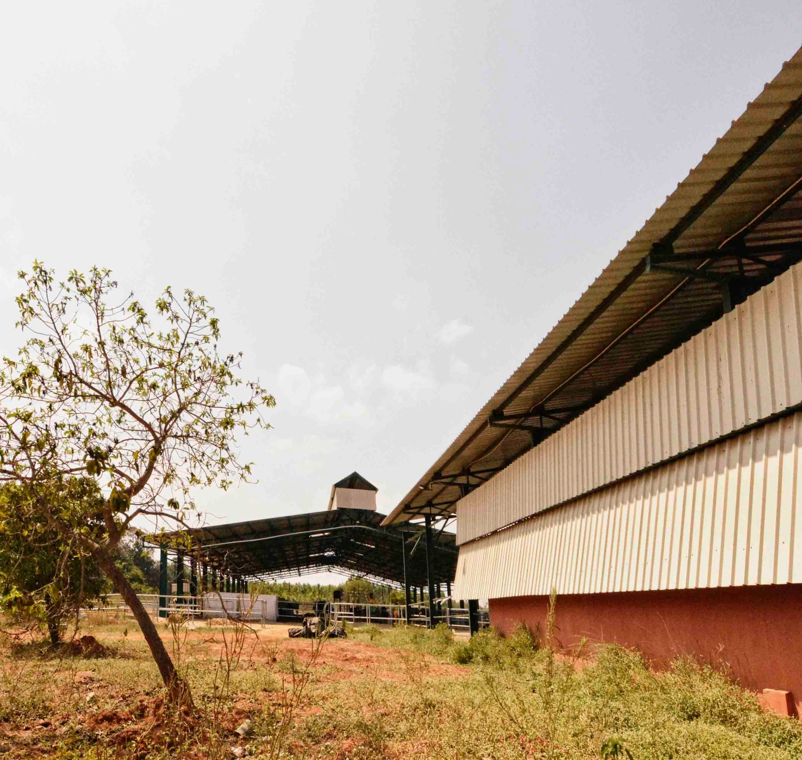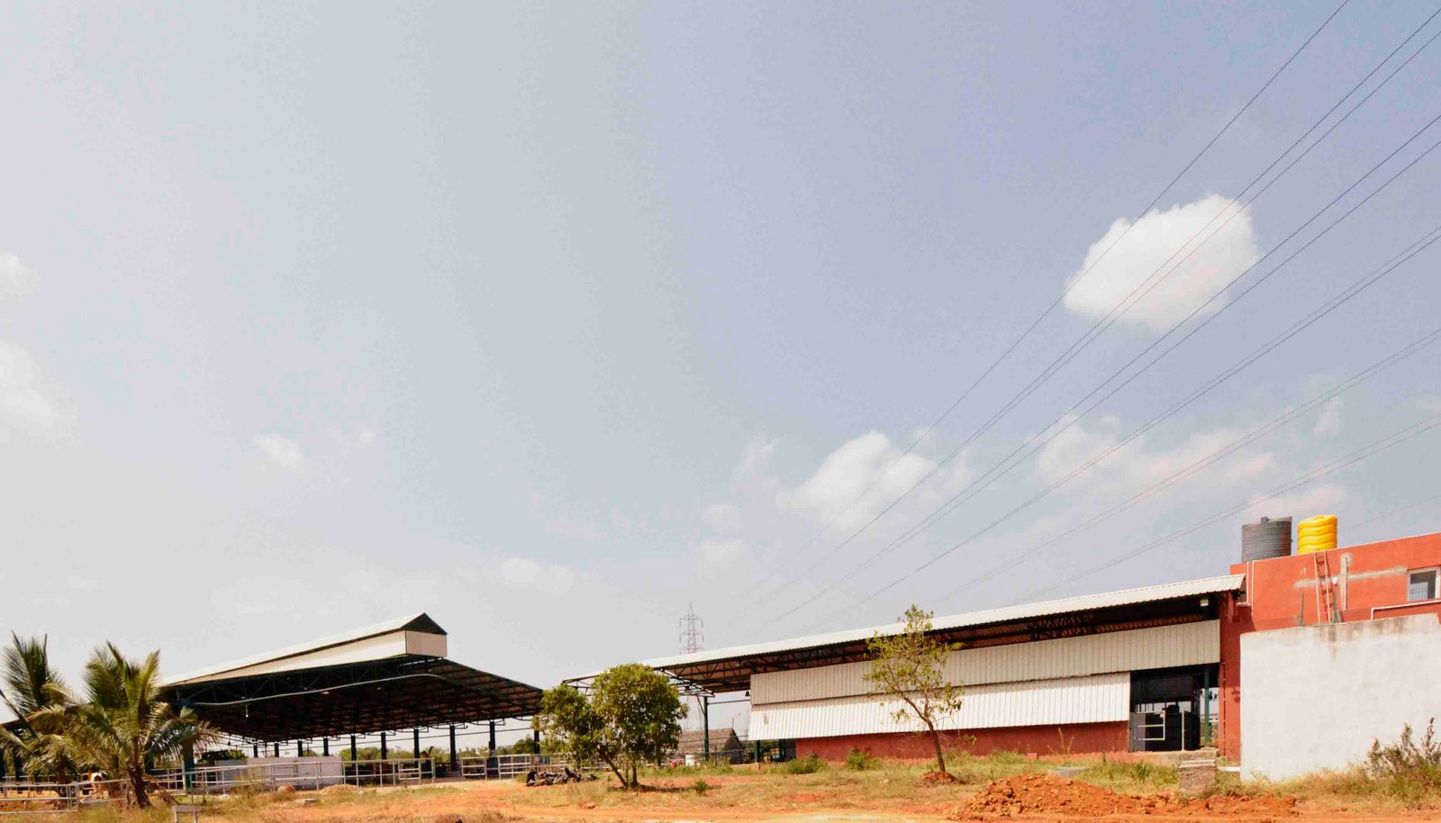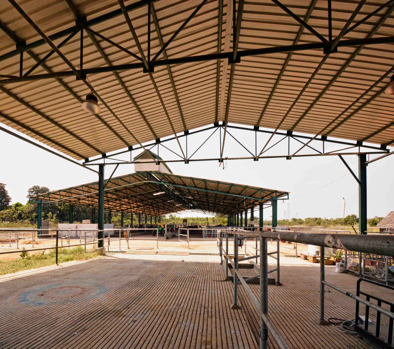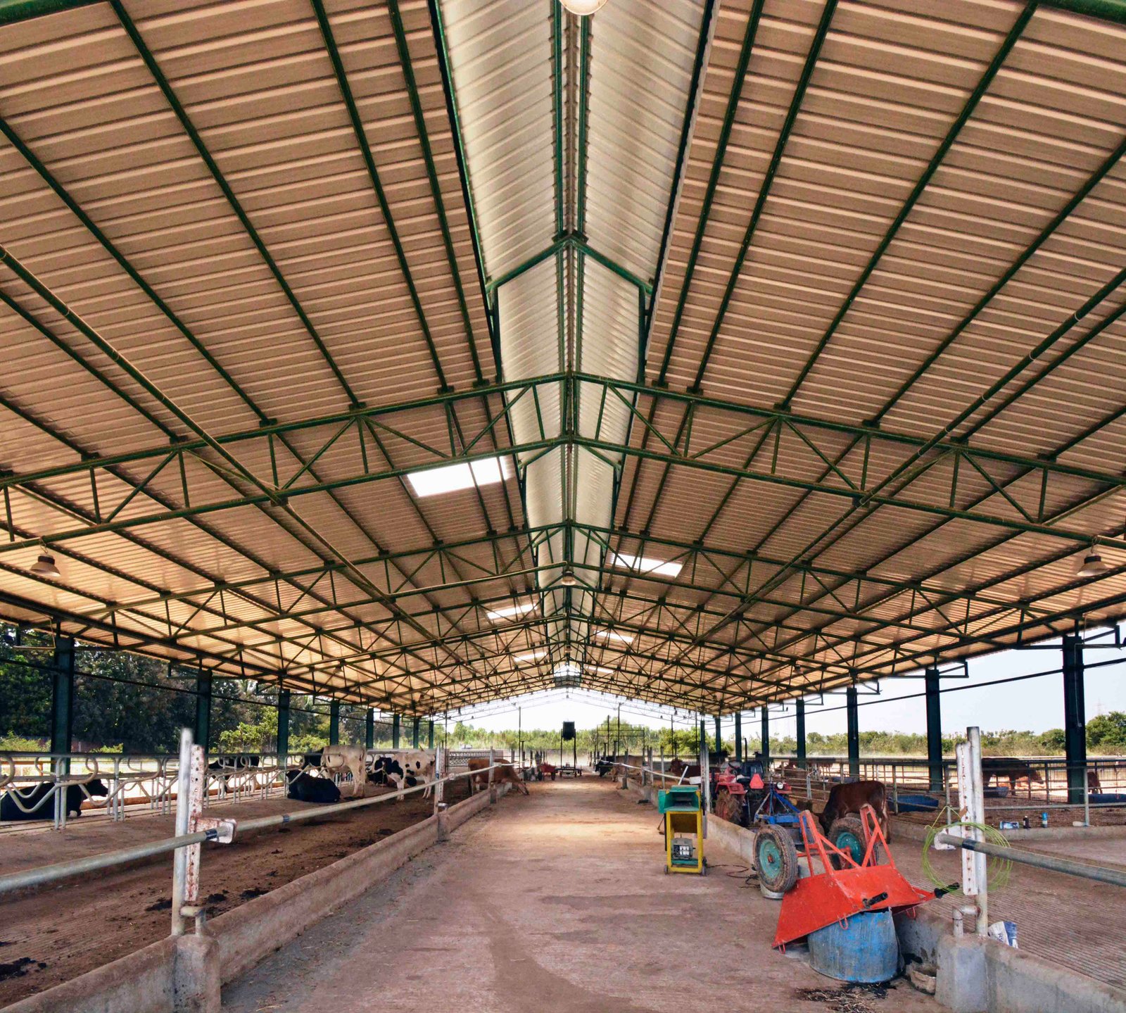 An organic dairy farm in the outskirts of Chennai for about 150 indigenous cattle was set up in about 5 acres of land; the project was developed under the guidance of DELAVAL. The requirement was two shelters that had to be designed and fabricated to suit cattle feeding breeding and milk production with the idea of using very little man force and easy logistics. The layout had to be cattle friendly aiding maintenance and management of cattle. Of the two units, one unit is where the milking process is carried using machinery and directly fed into the storage and packing facility, and the other larger unit for the feeding and housing of the cows. The structure is wide span with no central vertical support and the truss being designed using tubular sections and columns of ISMB section’s to minimize cost. Groves on the floor were done by placing fabricated grills on laying of concrete for easy drainage and maintenance of animal waste. And the roofing is of GI sheets.