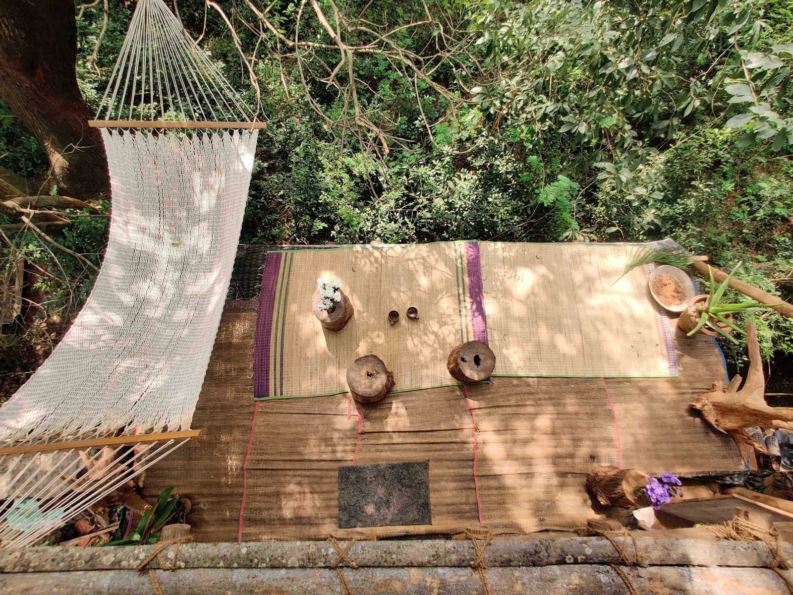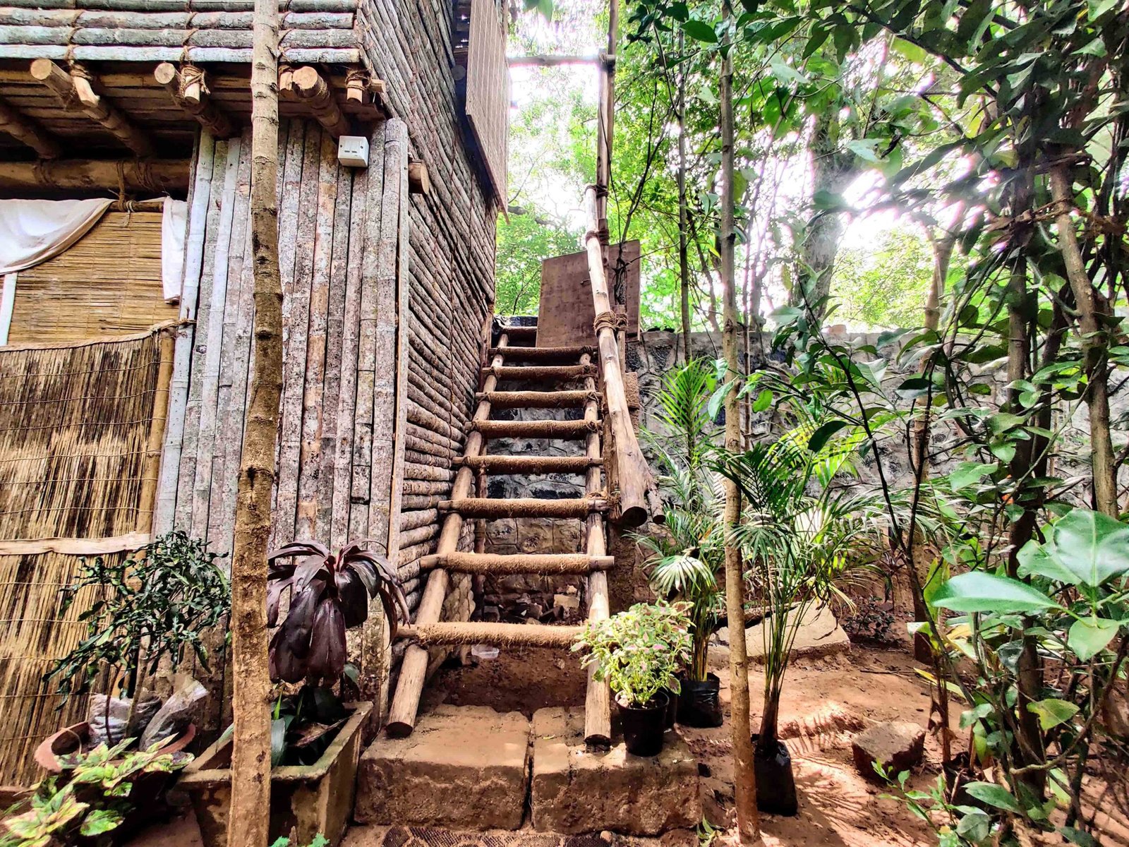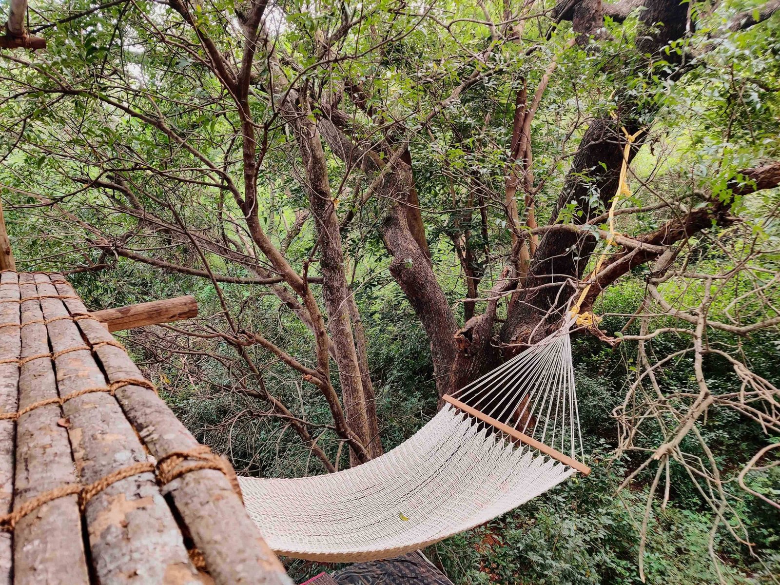 When you want to make less impact on the environment , you want to build with natural and locally available materials , we were fortunate to design and contribute a tree house for our client who wanted to connect with nature closely . The setup had to built with very less intervention with respect to the site area, For which we chose a tree near the compound wall and used the compound wall to support the balcony and house the open toilet and shower. The Setup is simple with a sleeping cum working place , opening to a deck / balcony with a hammock. with open views of the forest around. it was supported on granite pillars and the compound wall and was made out of casuarina tree logs and thatch roofing.